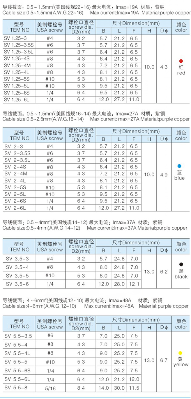 特征及用途:本產(chǎn)品系列端頭均據(jù)有關標準開發(fā)制造,可根據(jù)用戶需要鍍錫或鍍銀。 以及自由選用同規(guī)格大,中,小號。 端頭尾部尾縫焊銀,壓線內(nèi)孔制有螺紋線, 預絕緣端頭的絕緣套為阻燃硬質(zhì)量PVC材料,按有關標準通用顏色分等。 適用于:電控配電,繼電保護,電力電子和機床電器等成套設備,作為電連接接線線端 冷壓接的端頭產(chǎn)品。