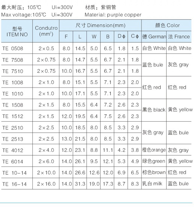TE雙線管型預(yù)絕緣端子 Home您現(xiàn)在的位置:網(wǎng)站首頁 >> 產(chǎn)品中心 >> 冷壓端子