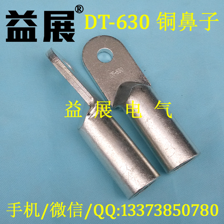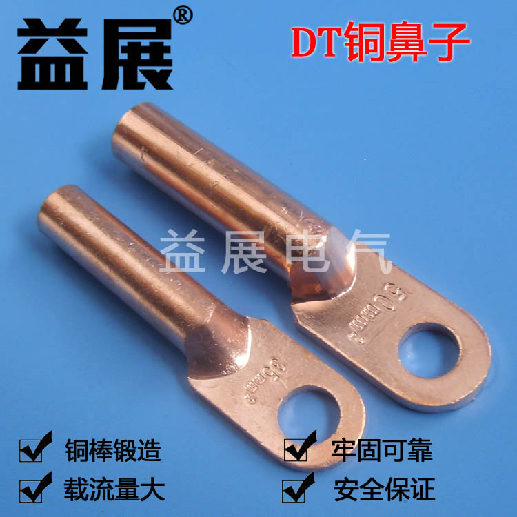 銅鼻子又稱銅管鼻,是用于電線電纜連接到電器設(shè)備上的連接件, 材質(zhì)一般為T2紫銅車制,也有黃銅的, 產(chǎn)品外貌為鍋鏟圓頭, 頂端這邊為固定上螺絲邊,末端為上剝皮后的電線電纜銅芯,品種分為堵油式和管壓式,堵油式較好,為了抵御空氣氧化,又有鍍錫即在銅鼻子表面鍍上一層錫,用以防止其氧化,變黑,大于10平方的才使用銅鼻子,小于10平方的電線不使用銅鼻子,改用冷壓線鼻。銅鼻子有表面鍍錫和不鍍錫管壓式堵油式之分。 DT銅鍍錫接線端子就是在原來DT銅接線端子的基礎(chǔ)上,在表層鍍上一層"錫",增強(qiáng)DT銅端子的導(dǎo)電能力。